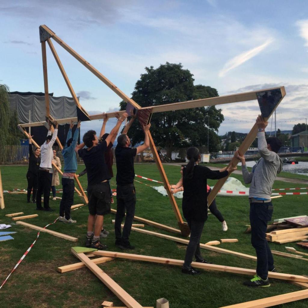 Vor Ort zusammen mit den Nutzer*innen geplante und gebaute Konstruktion. Das Tragwerk besteht, ähnlich wie bei der «Transfähre», aus drei am Boden vorgefertigten Rahmen, Fachwerke verbinden die Rahmen untereinander, der Pavillon auf der einen und die Rampe auf der anderen Seite bilden die beiden «Eckpfeiler». Mit einer Wandtafel versehen, konnte die überdachte Fläche so auch als «Outdoor-Klassenzimmer» genutzt werden.